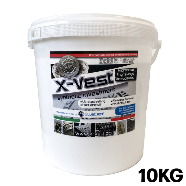 BlueCast a développé X-Vest pour répondre aux besoins des bijoutiers avancés qui demandent un revêtement de haute Performance, rapide, sûr (il est également disponible en liquide, pas de poudre à manipuler), solide mais facile à tremper, adapté à une Calcination rapide et avec l'assurance d'un "One Shot One Cast".