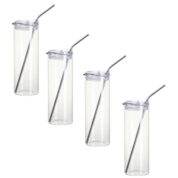 Ce lot contient 4 verres transparents avec chacun un couvercle en plastique et une paille en métalet dans un emballage individuel. Ces verres sont personnalisables par sublimation.